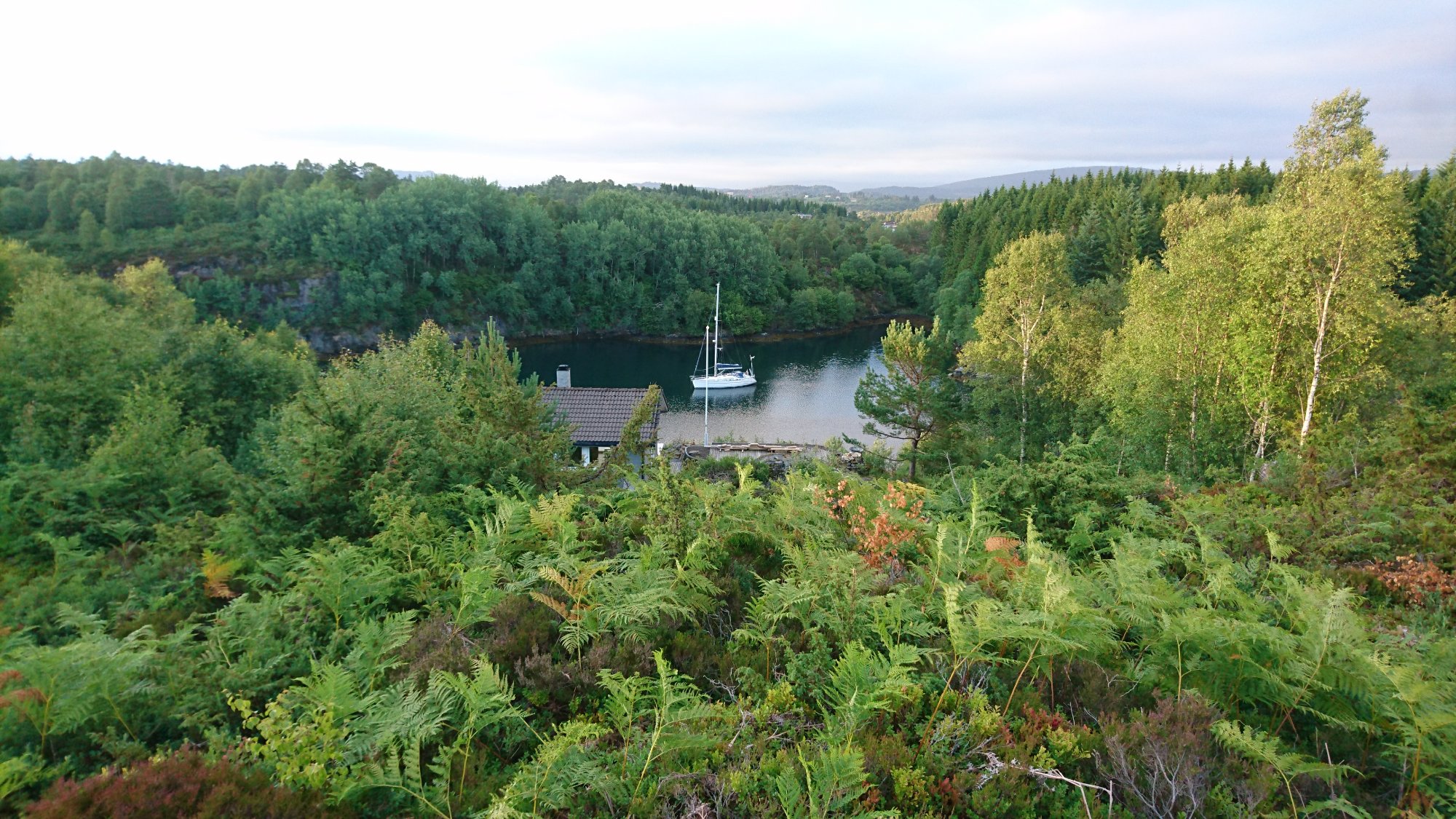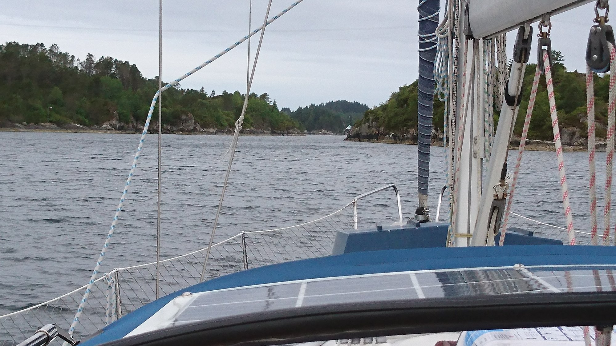 Da vi forlod Bergen, var det for at gå til Litlebergen. Ja sådan hedder det der. Vi fandt gastepladserne, som ligger uden på havnen, men I en lille beskyttet vig. Der var dog ingen beskyttelse mod dønninger fra forbipasserende motorbåde. Om natten er der dog sjældent gang i de norske motorbåde, så vi sov ganske godt. Næste dag besluttede vi at gøre endnu et forsøg på at afhjælpe den forstoppelse, som forhindrede os i at bruge vores toilet. Vi fik fat i 2,5m haveslange og en Gardena kobling. Koblede vores stykke på vandslangen på kajen og stak det op i toilettankens udløb. Selvom vi lå ved en flydebro og udløbet er kun 10 cm under vandlinien, så var det en vanskelig opgave, især da udløbet har en 90 grader bøjning lige indenfor skrogsiden. Det lykkedes dog at føre slangen op forbi bøjningen i to omgange og der blev spulet en del møg ud mens jeg rumsterede så kraftigt jeg magtede med overkroppen halvt ude over kanten på flydebroen og den ene arm nede i vandet under båden. Men der gik ikke hul på bylden. Vi opgav at løse problemet i denne omgang og satte kursen mod en beskyttet ankerplads hvor vanddybden ikke var 100 meter. På vej til denne ankerplads spørger Ines mig “har du lige pruttet?” Sådan spørger hun ind i mellem, men jeg spekulerer på om det nu også var et rimeligt spørgsmål udendørs i åben så og blæst. Især fordi jeg lige havde pruttet. Men så viste det sig at hun blot havde opsnappe gården af at proppen i toilettanken spontant havde opgivet sit forehavende, og jeg for alle tilfælde skyld havde sejlet med søventilen åben i mange dage, strømmede indholdet ud i kølvandet. Hurra! Hvilken lettelse! Næsten hele turen til ankerpladsen foregik for motor, pga den permanente modvind, men det var et dejligt sted vi fandt, og vi fik ikke brug for spanden.