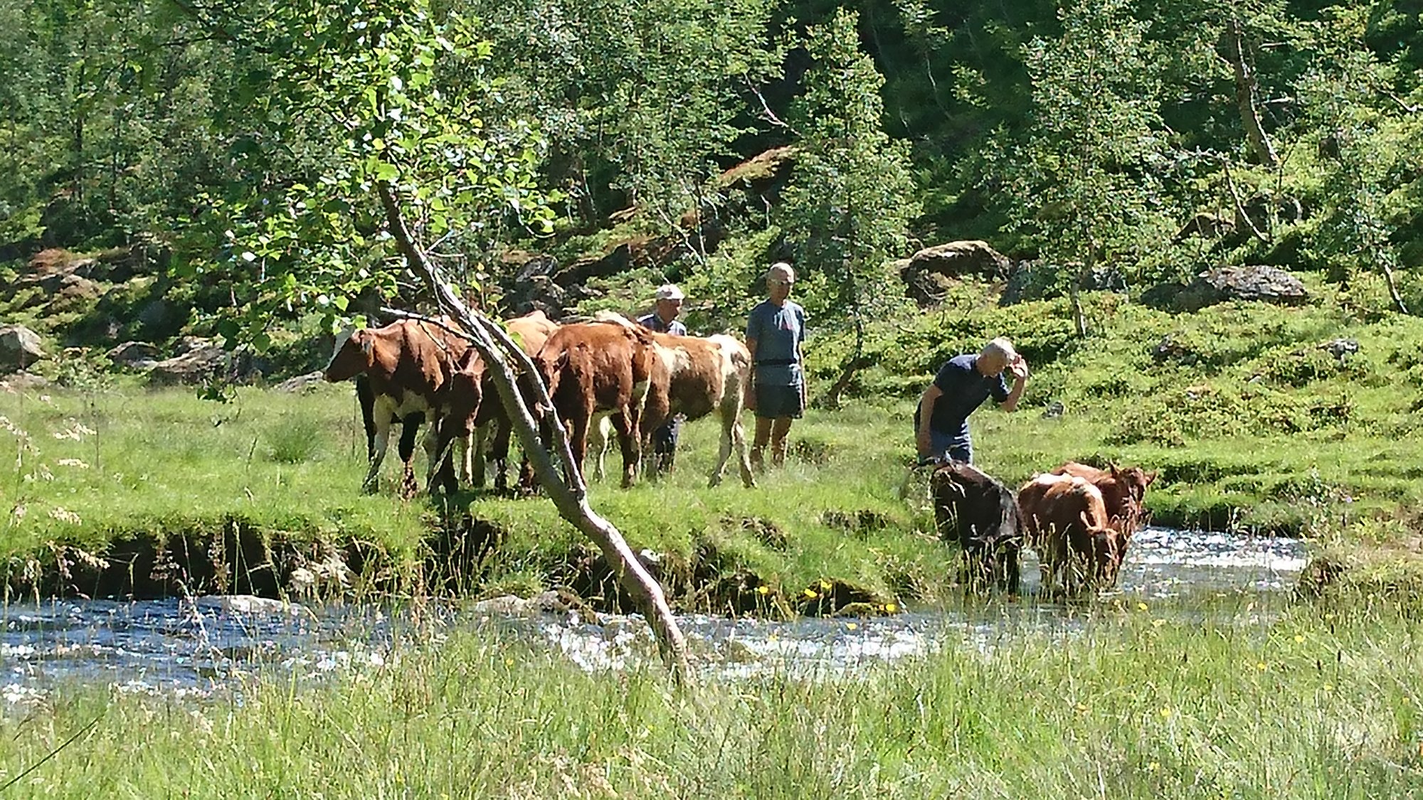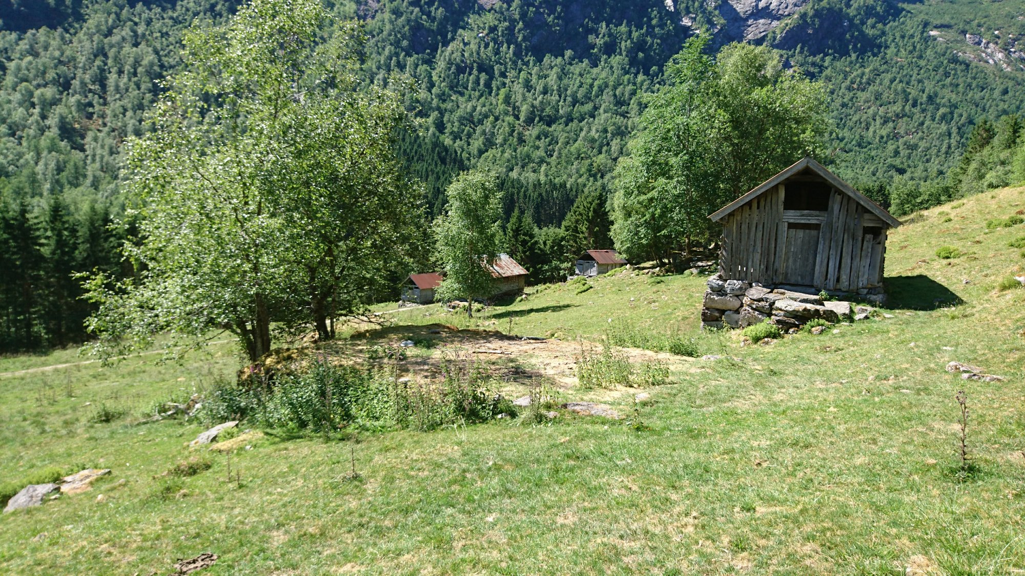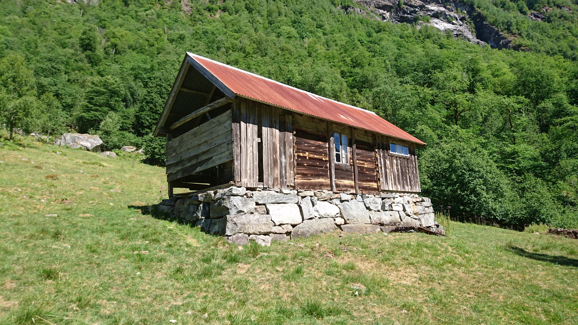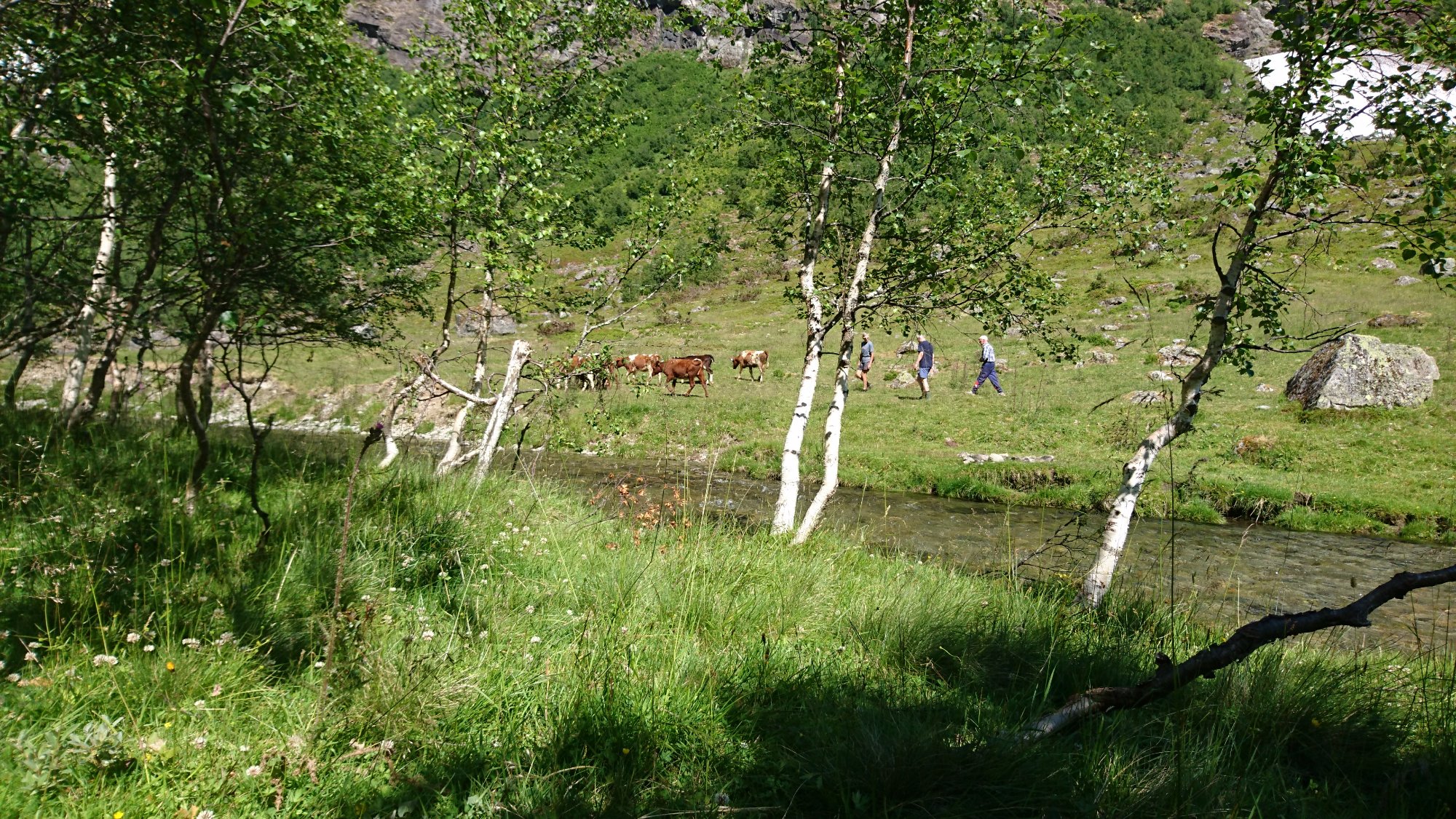 Out in the fjords it was common to send the cows away on summer pastures higher up in the valleys. We visited two summer pastures (2 støle) today, and especially the upper one was very beautiful. It used to be all the cows, and the women would stay with them and make cheese and sourmilk all summer. Today they just use the summer pastures for calfs.