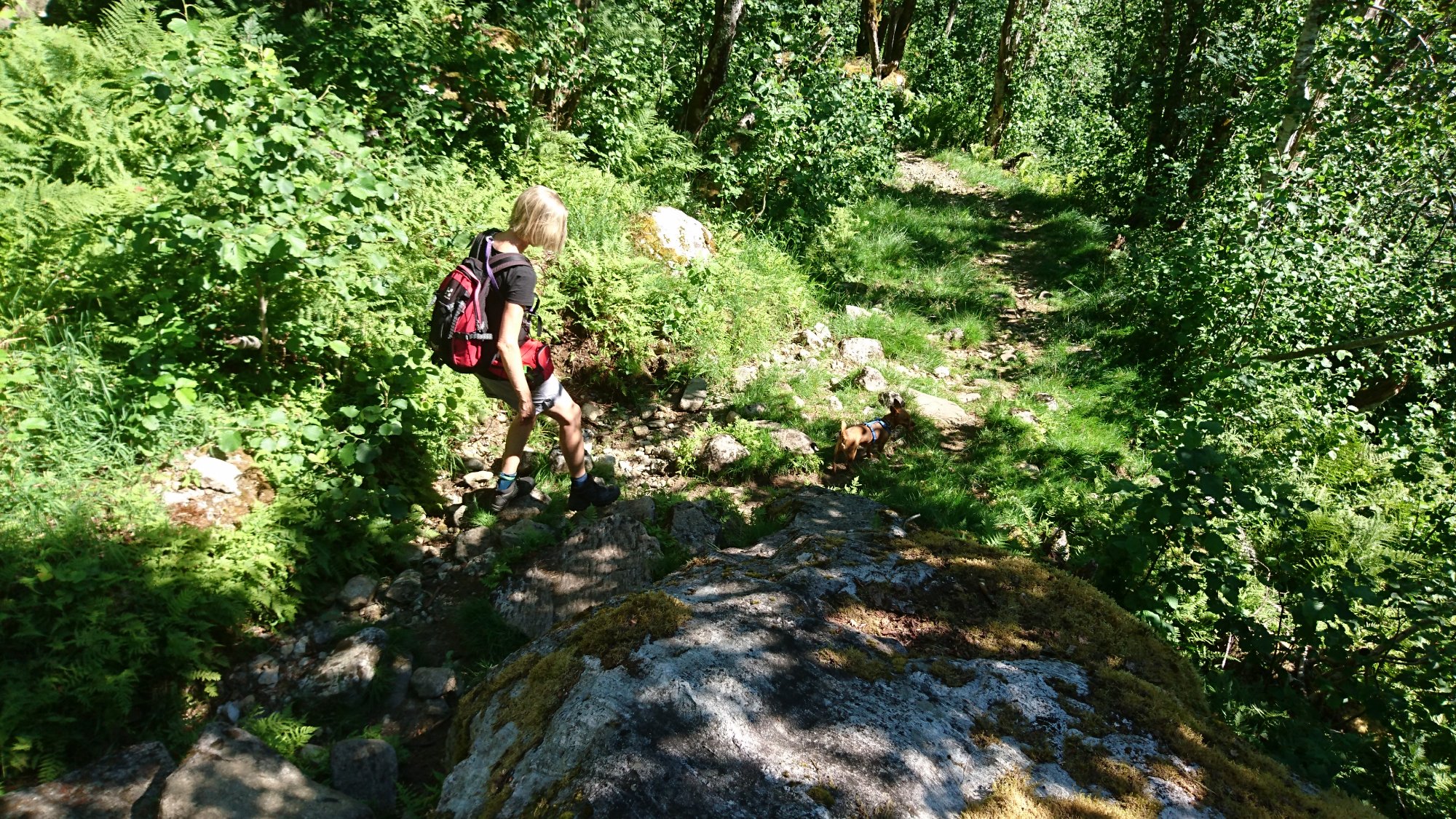 Den øverste støle var derimod en overraskelse. Traktorvejen var skrænket ind til en stenet stejl sti hvor vi holdt mange pauser pga varmen. Ja det var stegende varmt hele vejen op, og solen bagte fra en skyfri himmel. Da vi endeligt havde overstået den stejle sti, der nogen steder var stejl som en trappe, åbnede der sig en stor solbeskinnet rund helt flad græsflade, gennemstrømmet af en rivende, men ikke brusende elv, det hele omkranset af et tragtformet bjerg som om man var i bunden af en enorm vulkan. Ned ad bjergsiderne flossede vandet i små og store bække og vandfald, og uden en sky på himlen var der så varmt og stille som i en hedebølge. (??)