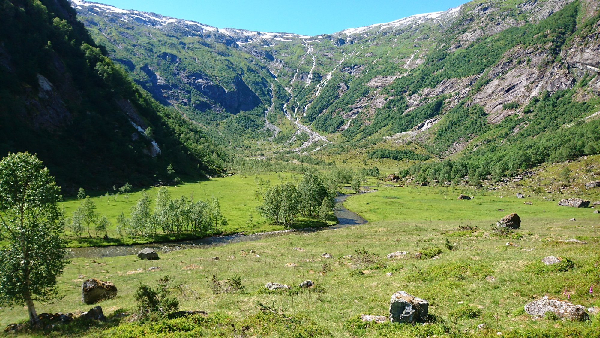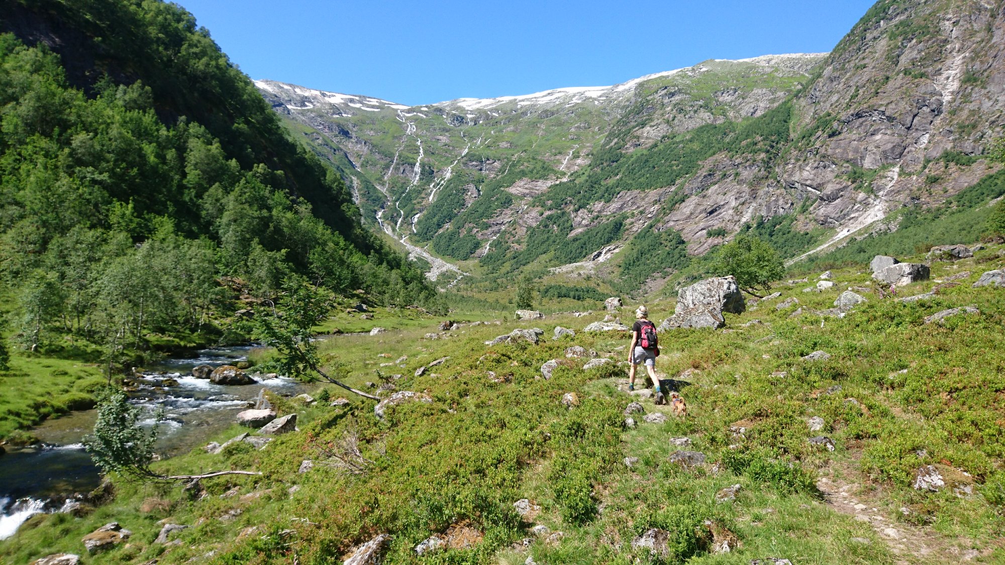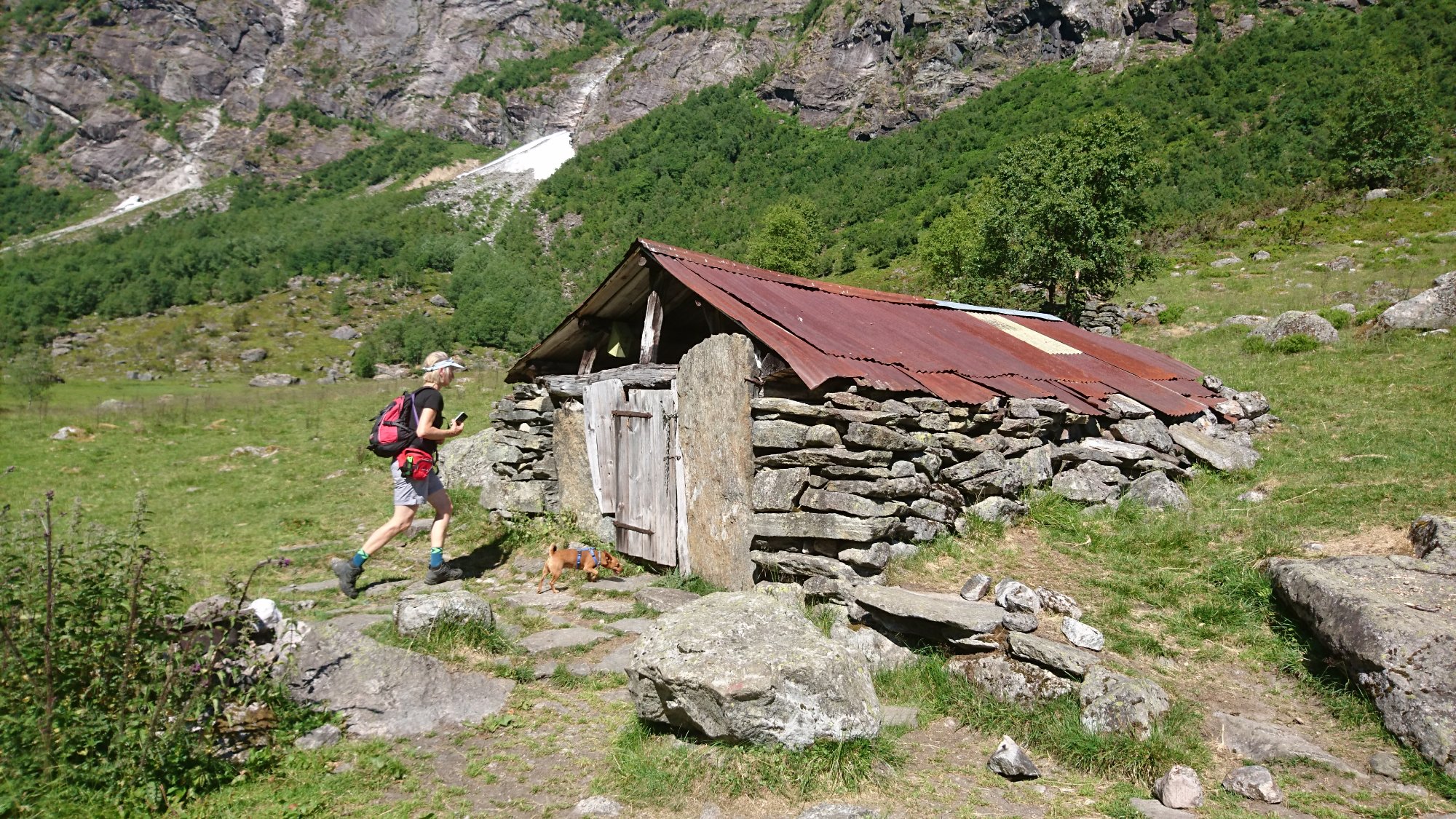 Out in the fjords it was common to send the cows away on summer pastures higher up in the valleys. We visited two summer pastures (2 støle) today, and especially the upper one was very beautiful. It used to be all the cows, and the women would stay with them and make cheese and sourmilk all summer. Today they just use the summer pastures for calfs.