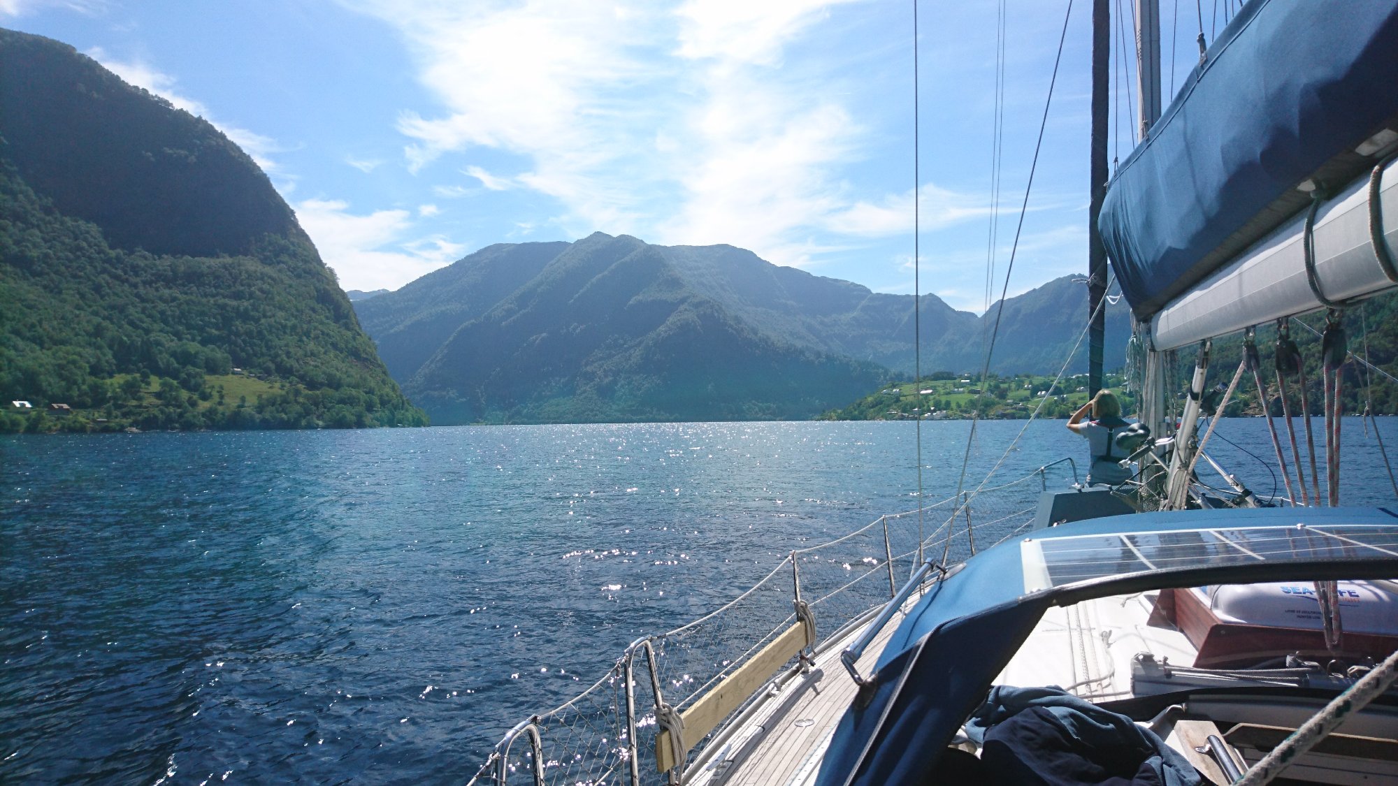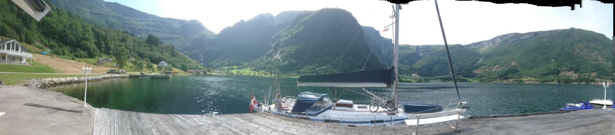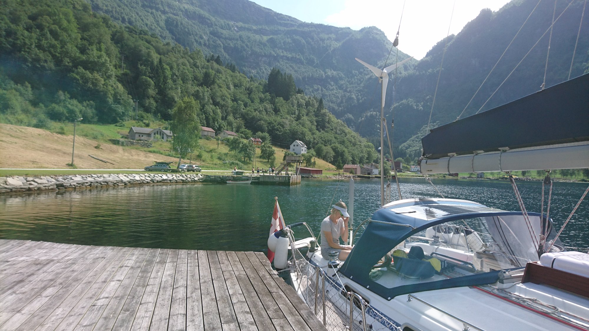 Efter at gave fisket efter cyklen på 25 meter vand sejlede vi videre i dag. Vi søgte efter et sted der var roligt, uden dønninger. Og det fandt vi. I bunden af den næste fjord, Arnafjorden, fandt vi et bjergomkranset paradis med sol, fred, vandfald, badende børn og en lille kaj hvor ejeren meget venligt tillod os at ligge natten over. Så nu har vi læst, og sovet, og spist lidt af Bertas madpakke (de har ikke Karens madpakker heroppe, men Bertas er identiske). Og skal nu bare lufte hunden og lave aftensmad. I morgen må vi så finde et sted med et godt TV signal. Man er vel verdensborger.