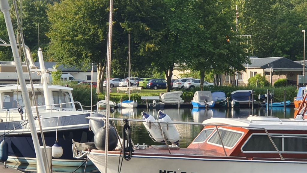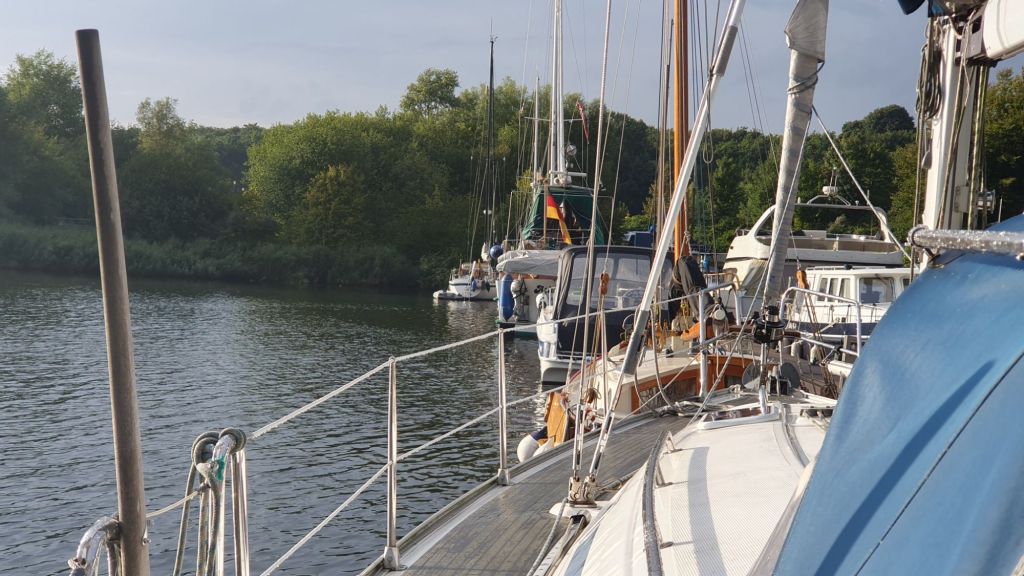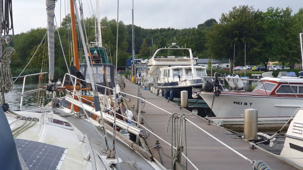 I regn og blæst sejlede jeg videre i Kielerkanalen for at komme til Rendsborg. Jeg havde udset mig en havneplads hos Büdelsdorfer Yachtclub fordi her kunne jeg ligge langskibs og det gør det meget nemmere at få min cykel sat i land, jeg skal nemlig lege turist i denne gamle fine by, som også har haft stor betydning i Danmarkshistorien. Büdelsdorf er en bydel lidt uden for den gamle bydel, og yachtklubben ligger meget grønt, og er meget gæstfri, så det er et rigtigt hyggeligt sted med gode faciliteter (vaskemaskine).