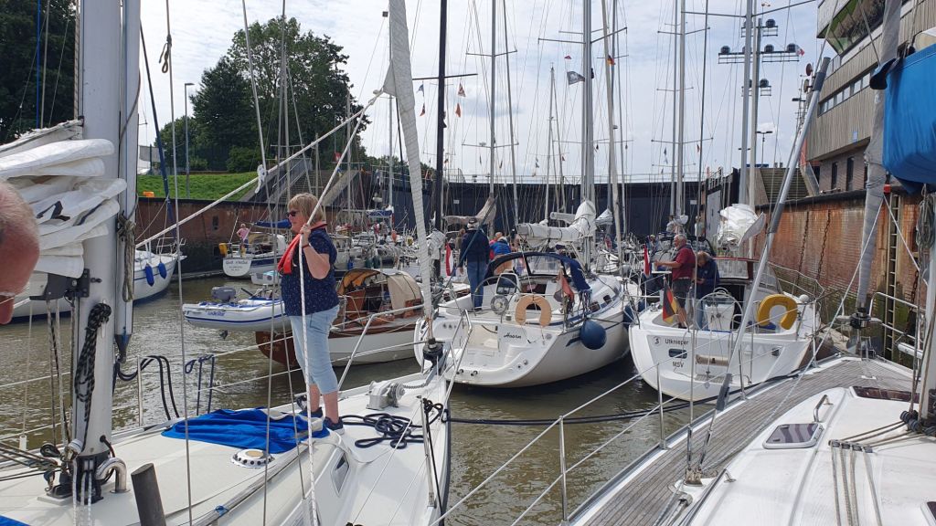 Turen til Helgoland begyndte i slusen, hvor der næsten var feststemning. Slusen var een af de gamle som er noget mindre end de nyere sluser og samtidig var der mange flere lystbåde som skulle igennem, så folk hjalp hinanden med at pakke bådene tæt.