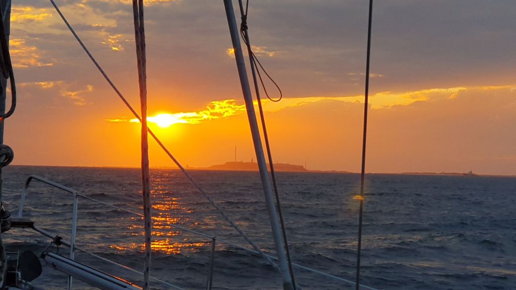 The trip was a long one. 50 nautical miles, with 5 knots (nautical miles pr hour) means ten hours. I though it would go faster, but I wasn’t in Helgoland harbour until 22.00, and it was already dark. At the end I was looking a lot after land, and it was pretty.