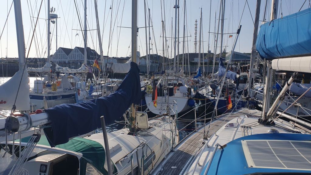 So this morning I moved into the inner harbour, where floating docks are laid out for the sailors. Too few I think, and the boats dock in layers and have to rearrange when somebody is leaving. And that’s not funny when you sail alone and have poor balance like I do.